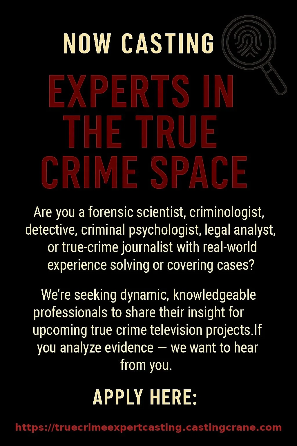 A major network is seeking knowledgeable professionals to appear across multiple new series. Investigators, journalists, attorneys, profilers, forensic specialists, academics, creators—if you work in the true-crime space, we want to hear from you!